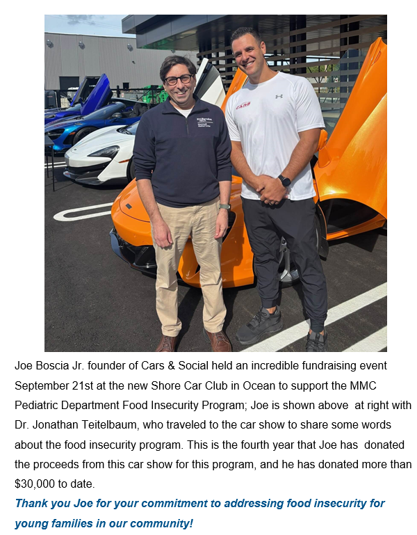 Dr. Jonathan Teitelbaum of Monmouth Medical Center attended the fundraiser to speak about the importance of supporting children and families facing food insecurity, praising Joe and the Cars & Social community for their continued dedication.